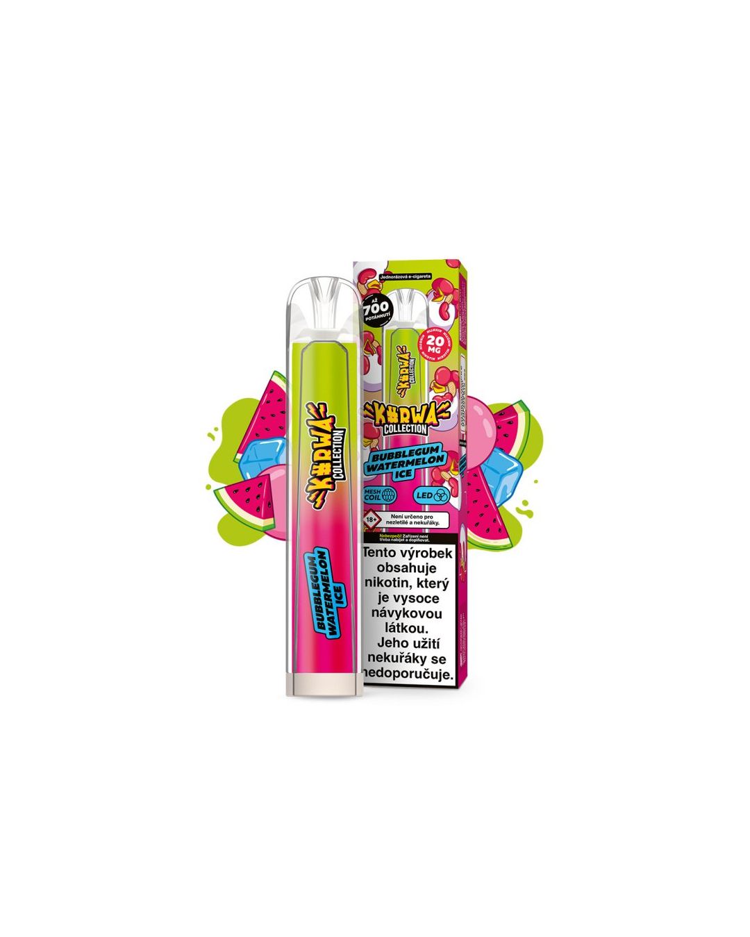 Die KURWA COLLECTION Bubblegum Watermelon Ice E-Zigarette bietet ein intensives Wassermelonen-Aroma umhüllt von süßem Bubblegum. Dieses Einweggerät ist nach einer einfachen Aktivierung durch Ziehen sofort einsatzbereit, der einzige Schritt, der nötig ist, um mit dem Dampfen zu beginnen.