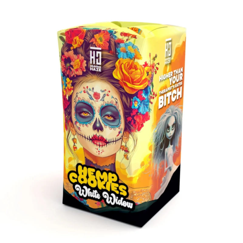 White Widow Hemp Cookies ist ein dekoratives und sammelbares Produkt, das Schokolade, Samen und Haferflocken enthält. Es wird in einer stilvollen Verpackung angeboten, die den Schwerpunkt auf Design und pflanzliche Inhaltsstoffe legt.