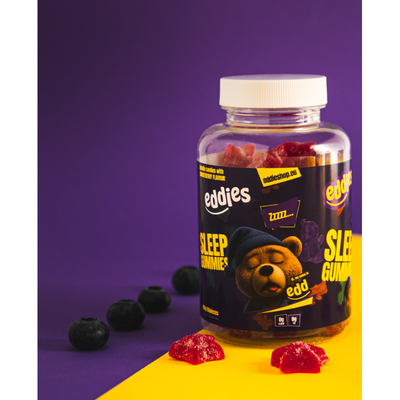 Eddies Sleep Gummies são um suplemento alimentar natural com melatonina e vitamina B6, concebido para promover o sono e uma melhor recuperação. Sem açúcar, com um subtil sabor a mirtilo - o ritual noturno perfeito para uma noite de descanso repousante.